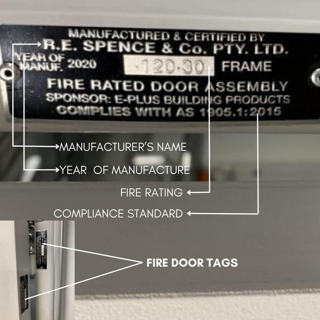 All fire doors in Australia should have a fire door tag. This tag is located on the inside of the door just below the top hinge, with another tag on the frame. A fire door tag typically contains key information such as: